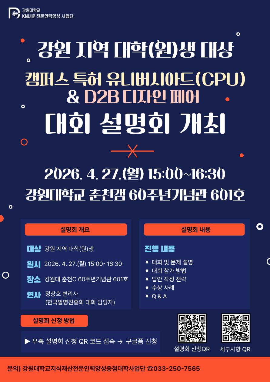 [IP사업단] "2026 캠퍼스 특허 유니버시아드(CPU), D2B 디자인페어 대회 설명회" 안내
